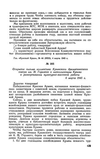 Открытое письмо коллектива Крымского драматического театра им. М. Горького к интеллигенции Крыма о развертывании культурно-массовой работы. 6 марта 1945 г. // Газ. «Красный Крым», № 45 (6024), 6 марта 1945 г.