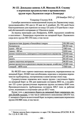 Докладная записка А.И. Микояна И.В. Сталину о перевозках продовольствия и промышленных грузов через Ладожское озеро в Ленинград. [10 декабря 1942 г.] // РГАСПИ. Ф. 82. Оп. 2. Д. 688. Л. 88-93. Подлинник. Машинописный текст.