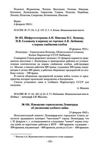 Шифротелеграмма А.И. Микояна П.С. Попкову, Н.В. Соловьеву и наркому по торговле А.В. Любимову о нормах снабжения хлебом. 20 февраля 1943 г. // РГАСПИ. Ф. 17. Оп. 167. Д. 65. Л. 71. Подлинник. Машинописный текст.