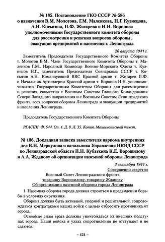 Докладная записка заместителя наркома внутренних дел В.Н. Меркулова и начальника Управления НКВД СССР по Ленинградской области П.Н. Кубаткина К.Е. Ворошилову и А.А. Жданову об организации наземной обороны Ленинграда. 3 сентября 1941 г.