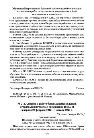 Справка о работе бытовых комсомольских отрядов Ленинградской организации ВЛКСМ в период 22 февраля 1942-1 января 1943 г. [Не ранее 1 января 1943 г.] // РГАСПИ. Ф. М-1. Оп. 47. Д. 77. Л. 9-13. Копия. Машинописный текст.