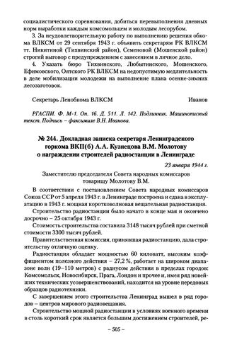 Докладная записка секретаря Ленинградского горкома ВКП(б) А.А. Кузнецова В.М. Молотову о награждении строителей радиостанции в Ленинграде. 23 января 1944 г. // РГАСПИ. Ф. 82. Оп. 2. Д. 631. Л. 122. Подлинник. Машинописный текст.