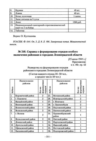 Справка о формировании отрядов особого назначения районами и городами Ленинградской области. [25 июля 1941 г.] // РГАСПИ. Ф. 644. Оп. 2. Д. 8. Л. 187. Заверенная копия. Машинописный текст.