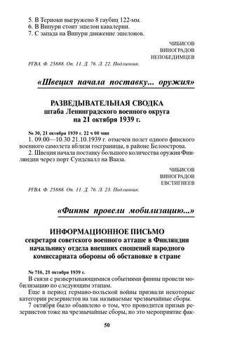 Информационное письмо секретаря советского военного атташе в Финляндии начальнику отдела внешних сношений народного комиссариата обороны об обстановке в стране. № 716, 21 октября 1939 г. // РГВА. Ф. 33987. Оп. 3. Д. 1240. Л. 88, 89. Копия.