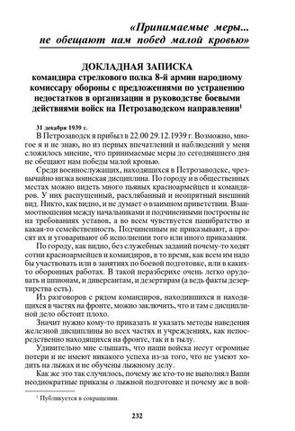 Докладная записка командира стрелкового полка 8-й армии народному комиссару обороны с предложениями по устранению недостатков в организации и руководстве боевыми действиями войск на Петрозаводском направлении. 31 декабря 1939 г.