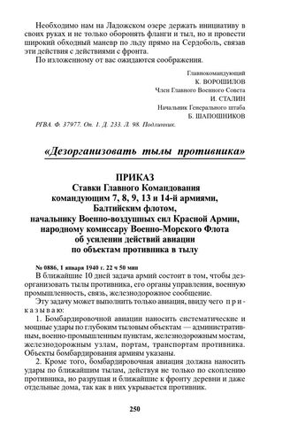 Приказ Ставки Главного Командования командующим 7, 8, 9, 13 и 14-й армиями, Балтийским флотом, начальнику Военно-воздушных сил Красной Армии, народному комиссару Военно-Морского Флота об усилении действий авиации по объектам противника в тылу. № 0886, 1 января 1940 г. 22 ч 50 мин // РГВА. Ф. 37977. Оп. 1. Д. 233. Л. 99. Подлинник.