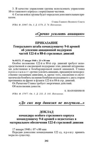 Доклад командира особого стрелкового корпуса командующему 9-й армией о недостатках в материальном обеспечении 122-й стрелковой дивизии. 17 января 1940 г. 07 ч 00 мин // РГВА. Ф. 34980. Оп. 5. Д. 279. Л. 9. Подлинник.