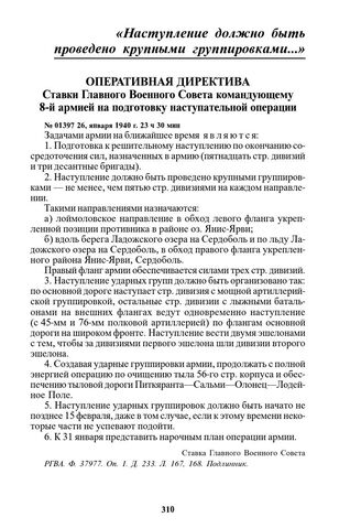 Оперативная директива Ставки Главного Военного Совета командующему 8-й армией на подготовку наступательной операции. № 01397 26, января 1940 г. 23 ч 30 мин // РГВА. Ф. 37977. Оп. 1. Д. 233. Л. 167, 168. Подлинник.