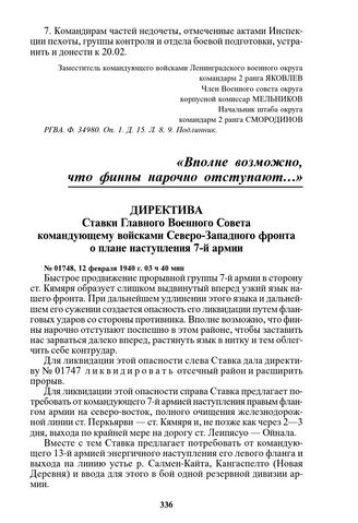 Директива Ставки Главного Военного Совета командующему войсками Северо-Западного фронта о плане наступления 7-й армии. № 01748, 12 февраля 1940 г. 03 ч 40 мин