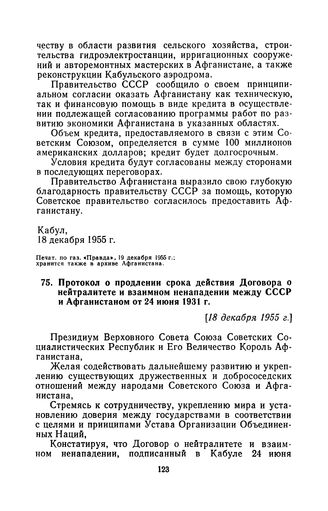 Протокол о продлении срока действия Договора о нейтралитете и взаимном ненападении между СССР и Афганистаном от 24 июня 1931 г. [18 декабря 1955 г.], составлен в городе Кабуле // Печат. по арх. Опубл. в газ. «Правда», 19 декабря 1955 г.