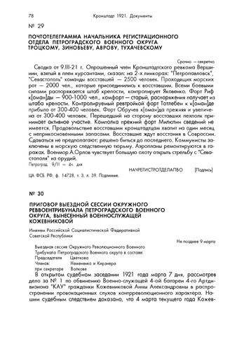 Приговор выездной сессии окружного реввоентрибунала Петроградского военного округа, вынесенный военнослужащей Кожевниковой. Не позднее 9 марта 1921 года