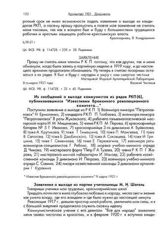 О выходе кронштадтцев из партии большевиков. Из сообщений о выходе коммунистов из рядов РКП(б), публиковавшихся "Известиями Временного революционного комитета..."