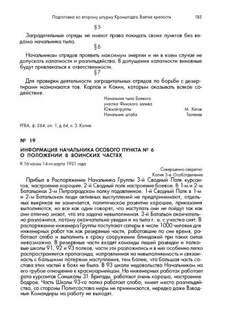 Информация начальника Особого пункта № 6 о положении в воинских частях. 14-го марта 1921 года // ЦА ФСБ РФ, ф. 114728, т. 5, л. 36. Подлинник.