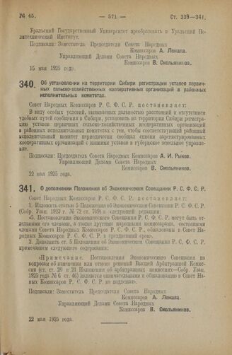 Декрет Совета Народных Комиссаров. Об установлении на территории Сибири регистрации уставов первичных сельско-хозяйственных кооперативных организаций в районных исполнительных комитетах. 22 мая 1925 года