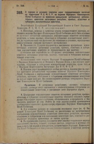 Декрет Всероссийского Центрального Исполнительного Комитета и Совета Народных Комиссаров. О порядке и условиях передачи дорог государственного значения на территории Р.С.Ф.С.Р. из ведения Народного Комиссариата Путей Сообщения во временное заведыв...