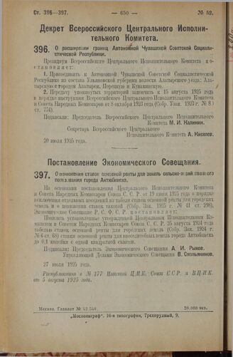 Декрет Всероссийского Центрального Исполнительного Комитета. О расширении границ Автономной Чувашской Советской Социалистической Республики. 20 июля 1925 года