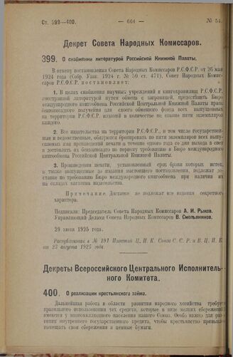 Декрет Всероссийского Центрального Исполнительного Комитета. О реализации крестьянского займа. 6 июля 1925 года