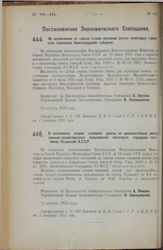 Постановление Экономического Совещания. О понижении ставок основной ренты на внеселитебные земли сельско-хозяйственного пользования некоторых городских поселений Казакской А.С.С.Р. 13 августа 1925 года