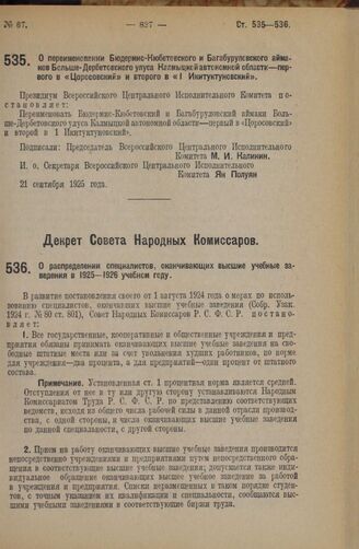 Декрет Совета Народных Комиссаров. О распределении специалистов, оканчивающих высшие учебные заведения в 1925—1926 учебном году. 25 сентября 1925 года