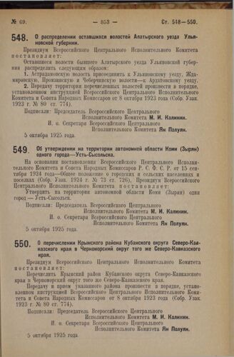 Декрет Всероссийского Центрального Исполнительного Комитета. О распределении оставшихся волостей Алатырского уезда Ульяновской губернии. 5 октября 1925 года