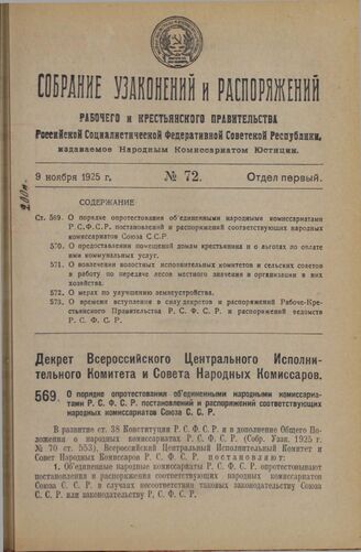 Декрет Всероссийского Центрального Исполнительного Комитета и Совета Народных Комиссаров. О порядке опротестования объединенными народными комиссариатами Р.С.Ф.С.Р. постановлений и распоряжений соответствующих народных комиссариатов Союза С.С.Р. 21 сентября 1925 года // Распубликован в № 247 Известий Ц.И.К. Союза С.С.Р. и В.Ц.И.К. от 28 октября 1925 года.