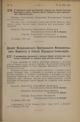 Декрет Всероссийского Центрального Исполнительного Комитета и Совета Народных Комиссаров. О воспрещении перечислять в местный бюджет остатки сумм, внесенных населением на передачу лесов местного значения. 12 октября 1925 года // Распубликован в № 243 Известий Ц.И.К. Союза С.С.Р. и В.Ц.И.К. от 23 октября 1925 года.