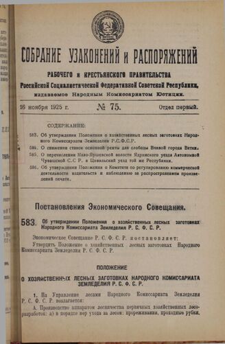 Постановление Экономического Совещания. Об утверждении Положения о хозяйственных лесных заготовках Народного Комиссариата Земледелия Р.С.Ф.С.Р. 1 октября 1925 года