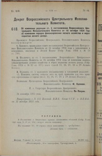 Декрет Всероссийского Центрального Исполнительного Комитета. Об изменении редакции ст. 5 постановления Всероссийского Центрального Исполнительного Комитета от 16 октября 1924 года об изменении порядка финансирования лесного хозяйства и мерах поднятия лесного дохода. 21 сентября 1925 года // Распубликован в № 233 Известий Ц.И.К. Союза С.С.Р. и В.Ц.И.К. от 11 октября 1925 года.
