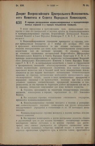 Декрет Всероссийского Центрального Исполнительного Комитета и Совета Народных Комиссаров. О порядке распределения национализированных и муниципализированных строений и о порядке пользования таковыми. 30 ноября 1925 года