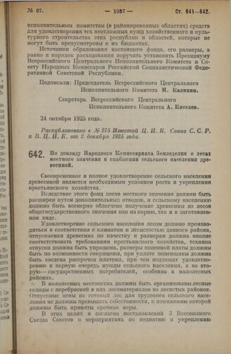 Постановление Всероссийского Центрального Исполнительного Комитета, принятое на 2 сессии XII созыва. По докладу Народного Комиссариата Земледелия о лесах местного значения и снабжении сельского населения древесиной. 24 октября 1925 года
