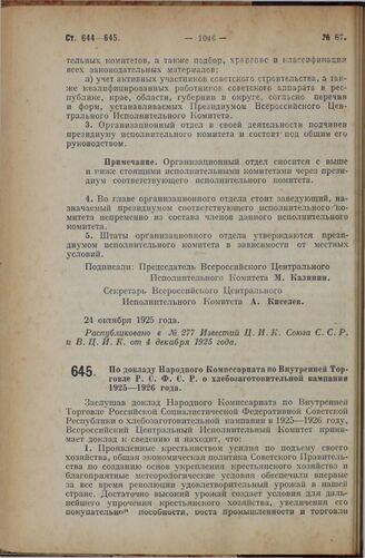 Постановление Всероссийского Центрального Исполнительного Комитета, принятое на 2 сессии XII созыва. По докладу Народного Комиссариата по Внутренней Торговле Р.С.Ф.С.Р. о хлебозаготовительной кампании 1925—1926 года. 24 октября 1925 года // Распубликовано в № 278 Известий Ц.И.К. Союза С.С.Р. и В.Ц.И.К. от 5 декабря 1925 года.