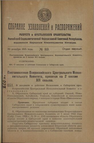 Постановление Всероссийского Центрального Исполнительного Комитета, принятое на 2 сессии XII созыва. О введении в действие Положения о Сибирском крае. 24 октября 1925 года