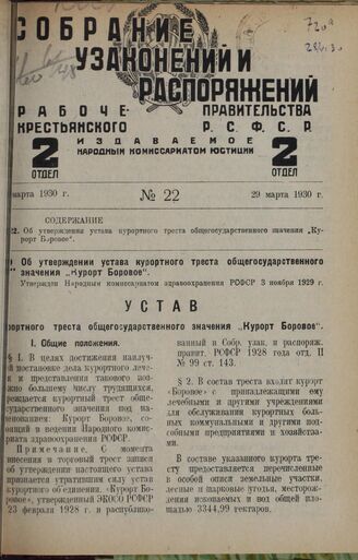 Собрание узаконений и распоряжений Рабоче-Крестьянского правительства РСФСР за 1930 г. № 1-52. Отдел второй. — М., б. г.