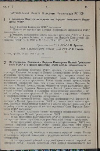 Постановление Совета Народных Комиссаров РСФСР. О ликвидации Комитета по игрушке при Народном Комиссариате Просвещения РСФСР. 20 мая 1938 г. № 130