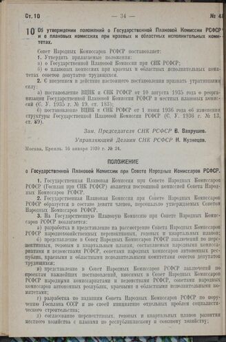 Постановление Совета Народных Комиссаров РСФСР. Об утверждении положений о Государственной Плановой Комиссии РСФСР и о плановых комиссиях при краевых и областных исполнительных комитетах. 16 января 1939 г. № 24