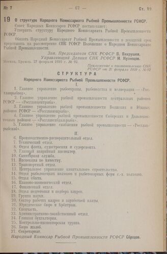 Постановление Совета Народных Комиссаров РСФСР. О структуре Народного Комиссариата Рыбной Промышленности РСФСР. 27 февраля 1939 г. № 92