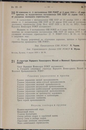 Постановление Совета Народных Комиссаров РСФСР. О структуре Народного Комиссариата Мясной и Молочной Промышленности РСФСР. 7 марта 1939 г. № 105