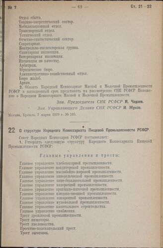 Постановление Совета Народных Комиссаров РСФСР. О структуре Народного Комиссариата Пищевой Промышленности РСФСР. 7 марта 1939 г. № 106
