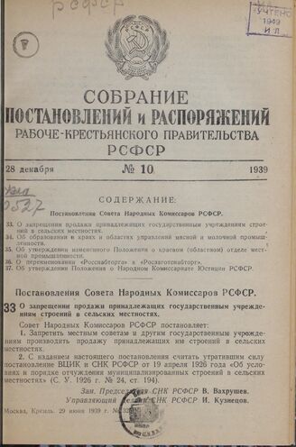 Постановление Совета Народных Комиссаров РСФСР. О запрещении продажи принадлежащих государственным учреждениям строений в сельских местностях. 29 июня 1939 г. № 325