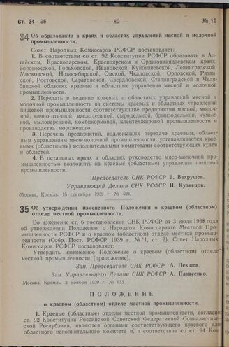 Постановление Совета Народных Комиссаров РСФСР. Об образовании в краях и областях управлений мясной и молочной промышленности. 15 сентября 1939 г. № 489