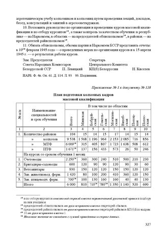 Приложение к постановлению СНК БССР и ЦК КП(б)Б «О подготовке колхозных кадров массовой квалификации». 9 января 1945 г. План подготовки колхозных кадров массовой квалификации // НАРБ. Ф. 4п. Оп. 61. Д. 114. Л. 96.