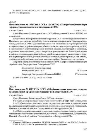 Постановление № 1961 СНК СССР и ЦК ВКП(б) «О дифференциации норм зернопоставок по колхозам Белорусской ССР». г. Москва, 3 августа 1945 г. // ГА РФ. Ф. P-5446. Oп. 1. Д. 259. Л. 224. Копия.