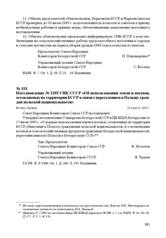 Постановление № 2105 СНК СССР «Об использовании земли и посевов, оставляемых на территории БССР в связи с переселением в Польшу граждан польской национальности». Москва, 22 августа 1945 г. // ГА РФ. Ф. Р-5446. Oп. 1. Д. 260. Л. 355. Подлинник.