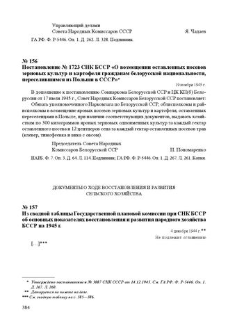 Постановление № 1723 СНК БССР «О возмещении оставленных посевов зерновых культур и картофеля гражданам белорусской национальности, переселившимся из Польши в СССР». 19 ноября 1945 г. // НАРБ. Ф. 7. Оп. 3. Д. 64. Л. 114. Подлинник; ГА РФ. Ф. Р-5446. Oп. 1. Д. 267. Л. 261. Копия.