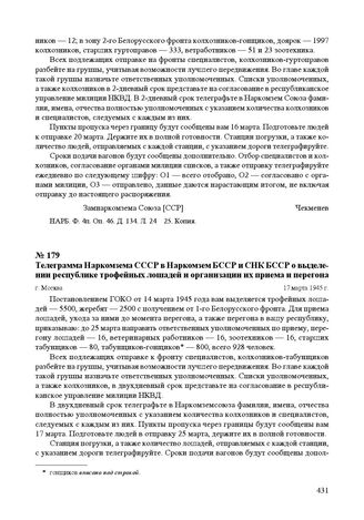 Телеграмма Наркомзема СССР в Наркомзем БССР и СНК БССР о выделении республике трофейных лошадей и организации их приема и перегона. г. Москва, 17 марта 1945 г.