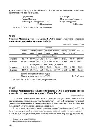 Справка Министерства земледелия БССР о выработке установленного минимума трудодней в колхозах за 1945 г. Не позднее 1 июня 1946 г. // НАРБ. Ф. 4п. Оп. 46. Д. 212. Л. 456. Заверенная копия.
