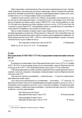 Постановление № 820 СНК СССР об утверждении специализации совхозов БССР. г. Москва, 22 апреля 1945 г. // ГА РФ. Ф. Р-5446. Oп. 1. Д. 250. Л. 225. Подлинник; НАРБ. Ф. 31. Оп. 4. Д. 147. Л. 146. Заверенная копия.