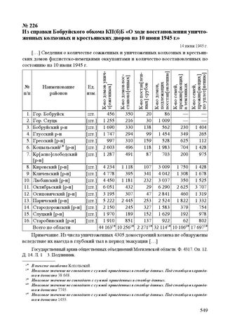 Из справки Бобруйского обкома КП(б)Б «О ходе восстановления уничтоженных колхозных и крестьянских дворов на 10 июня 1945 г.». 14 июня 1945 г.