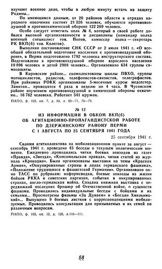 Из информации в обком ВКП(б) об агитационно-пропагандистской работе по Дзержинскому району Перми с 1 августа по 25 сентября 1941 года. 25 сентября 1941 г. // ПАПО, ф. 105, оп. 12, д. 126. Л.110-111.