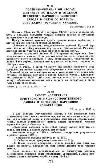 Политинформация об итогах митингов по цехам и отделам Пермского паровозоремонтного завода в связи со взятием советскими войсками Харькова. 24 августа 1943 г. // ПАПО, ф. 78, оп. 6. д. 105. л. 120.